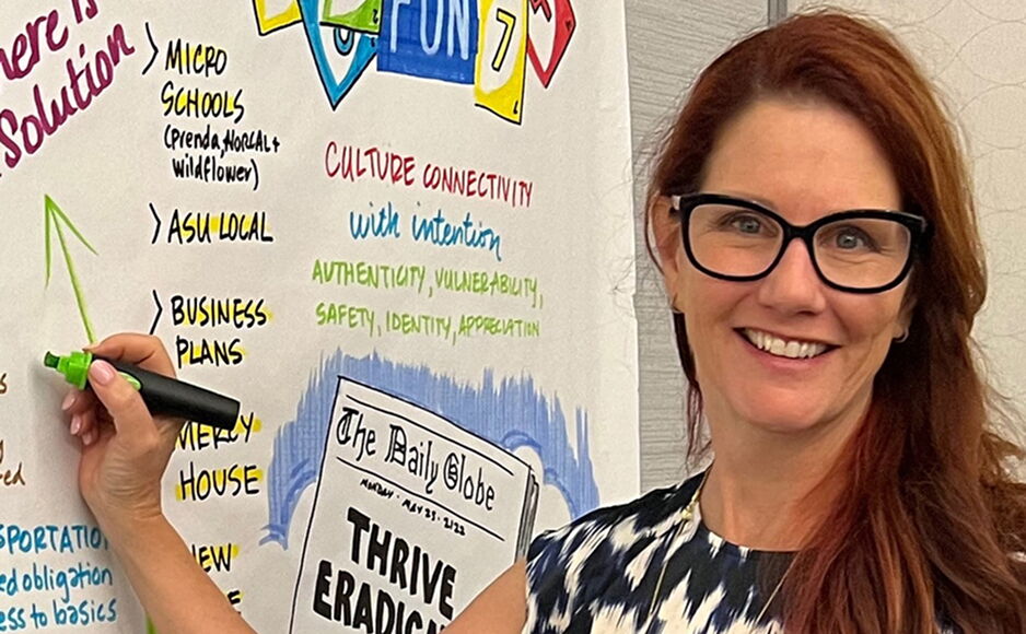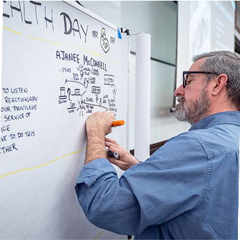 Graphic facilitation combines visual thinking with group process skills to guide teams toward alignment and action. By mapping conversations as they unfold, it helps groups see connections, solve problems, and co-create meaningful outcomes.